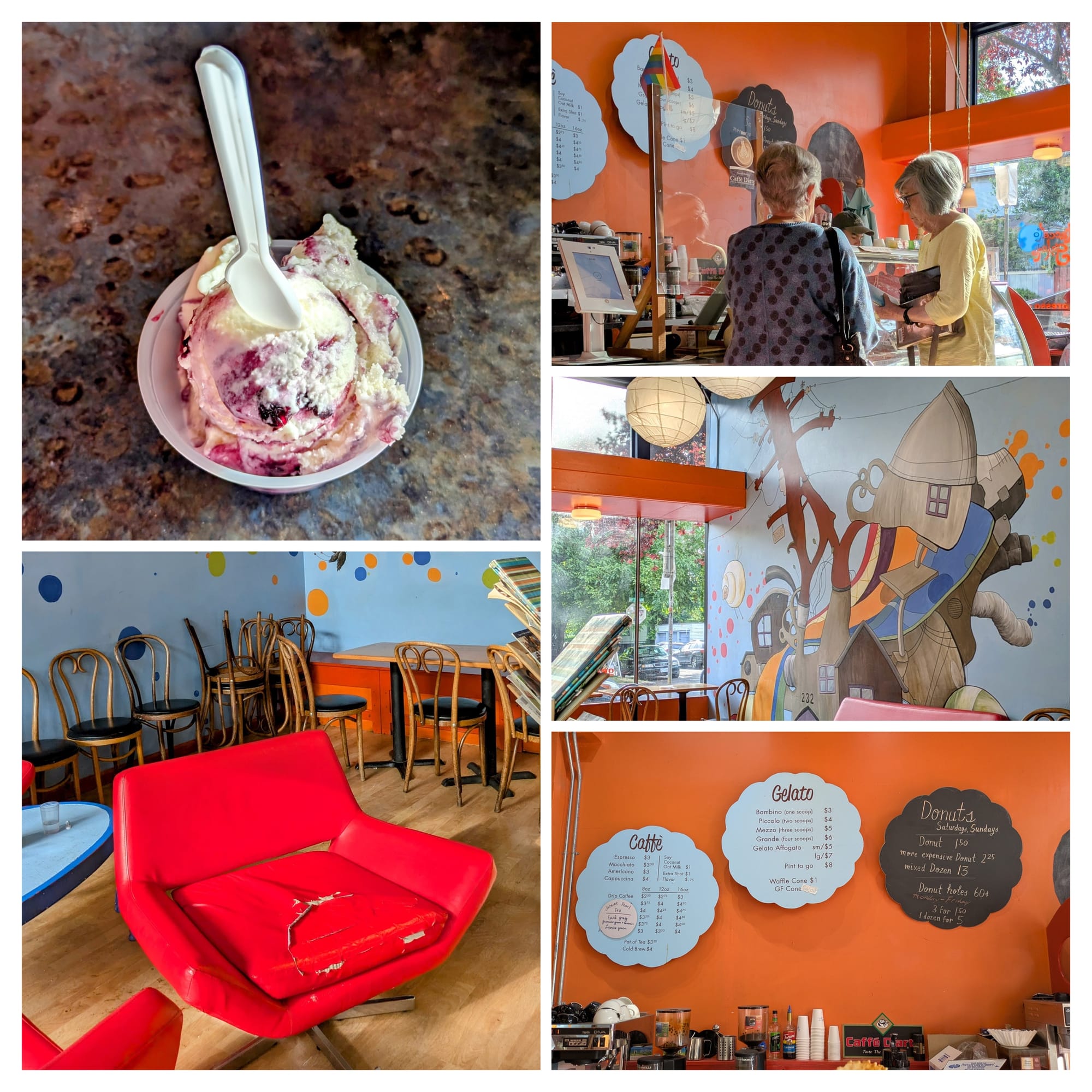 The menu is a triple threat: gelato, coffee, and weekend donuts. We kept it classic — a scoop of their tangy blueberry in a cup and a root beer float gelato on a cone. $3 each. That’s not a typo — just a blessed anomaly in a world where a single scoop can run you a full Lincoln. The flavors hit a sweet spot: flavorful without being cloying, nostalgic without being bland.