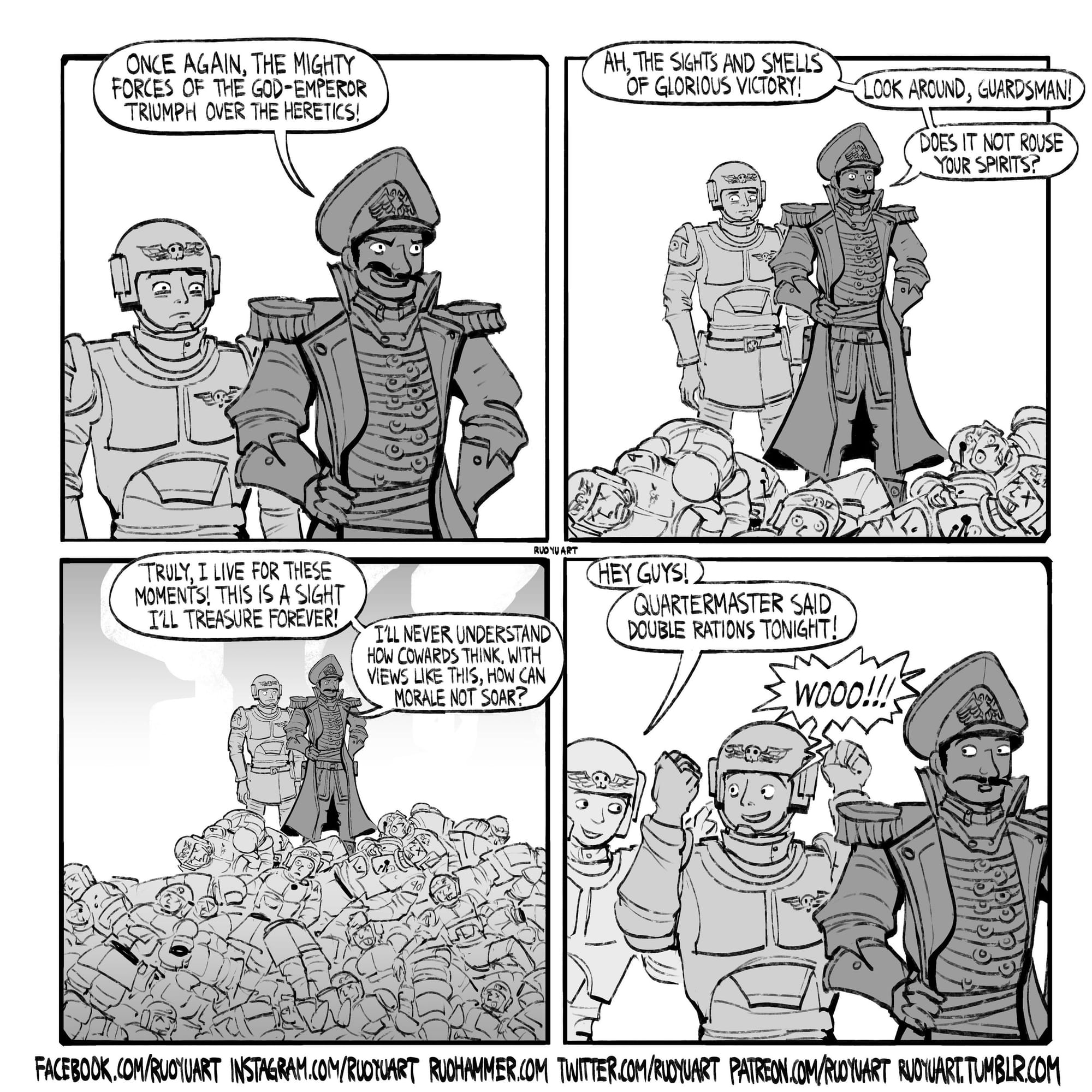 This reminds me of a Warhammer 40,000 comic where Imperial Guard officers stand atop a literal mountain of corpses, celebrating their "glorious victory" and wondering why morale isn't higher among the surviving troops. When the quartermaster announces double rations, the soldiers cheer—not realizing they're about to eat their fallen comrades processed into corpse-starch.