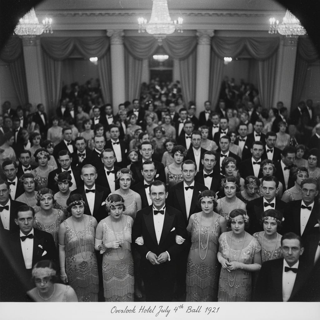 The Shining ends with a photograph. Jack Torrance, frozen to death in the hedge maze, appears in a 1921 photograph hanging in the Overlook's ballroom. He's at the center of a July 4th party, smiling, surrounded by elegant guests. The caption reads: "Overlook Hotel, July 4th Ball, 1921."