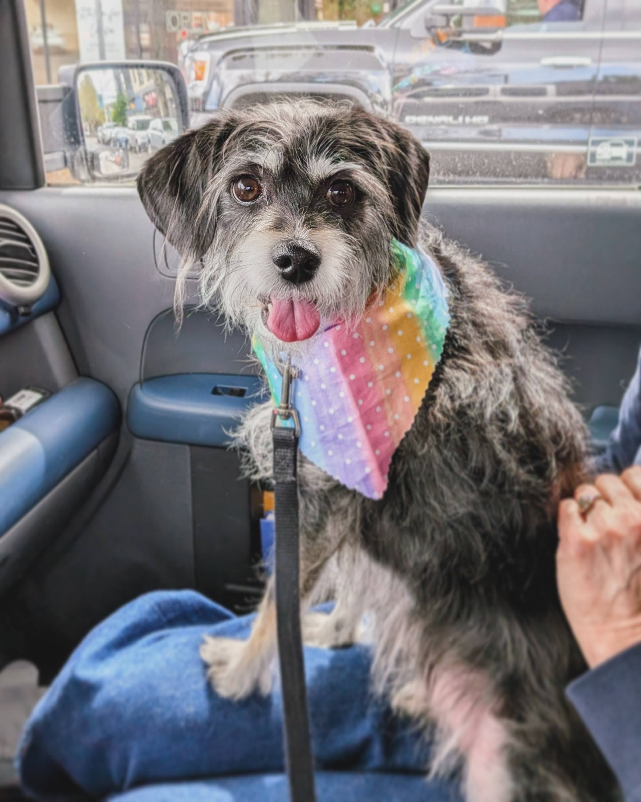 They were gone for a long time. I know this because I slept four times at the place that isn't home, where the water bowl is different and someone else's dog had been in my spot. They put a cloth on me when I left. Rainbow. I didn't ask for it. I wore it because arguing takes more energy than compliance, and I wanted to get in the car.