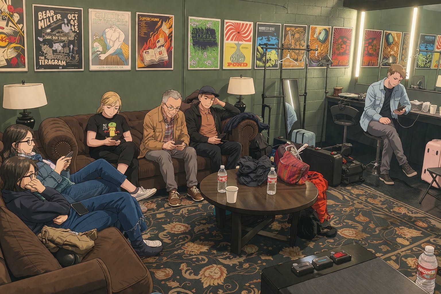 Hanger-on, barnacle, waving hi to folks in Kids On A Crime Spree and the Tony Molina crew (Hello Bill, hello Mario, I'm writing down your names because I'm going to get quizzed later, hello again Alicia and Tony), knowing how the bass pedals, amps, and direct input are connected, burning AI tokens to make a pastel-colored, slice-of-life anime style of the band in the green room. It looks like they’re all doom scrolling; they’re finalizing the guest list via Google Sheets. I've already forgotten the name of the Teragram's house engineer.