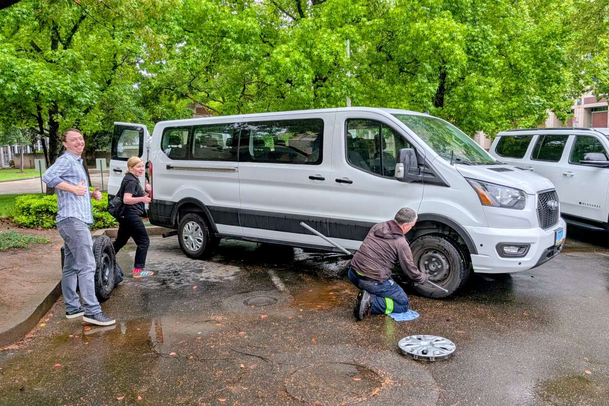 They keep looking at a rectangle and showing each other pictures. There is a van involved. I do not like vans. There was apparently a tire, which I understand is a round rubber thing, and it broke, which I understand is what things do.