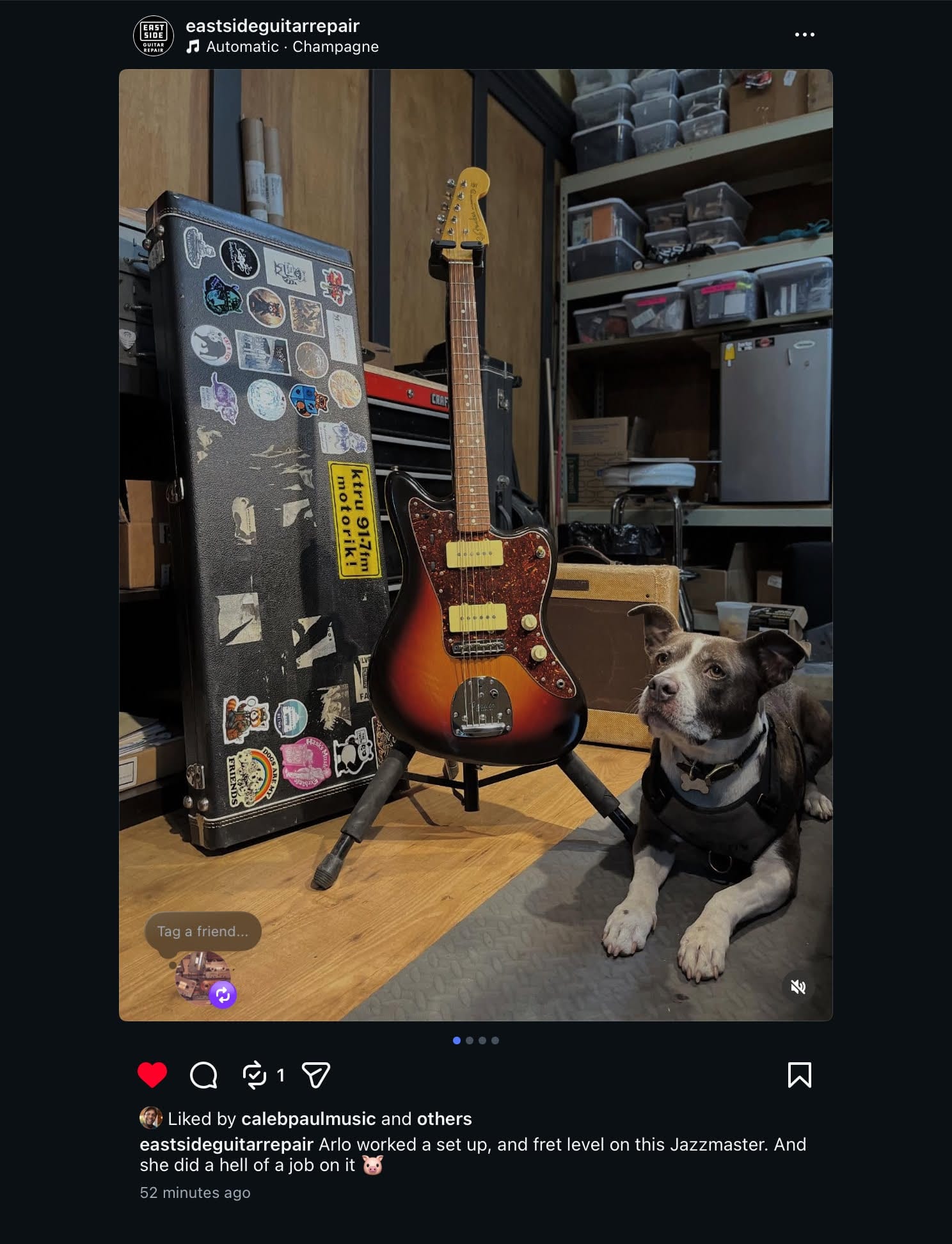 The household filled while I slept. The spouse's Telecaster—older than me, a college guitar carrying jangle-pop dreams overshadowed by folk—held quiet court in the corner. The Mustang Bass arrived, bright and beloved. The Precision flexed about fifteen minutes on stage with a hardcore band. The Goth Thunderbird sulked in dropped-D tuning. The fretless Jazz muttered Stewie Griffin commentary from the shadows. An Epiphone SG showed up, red and cocky, teaching him that AC/DC's power came from cowboy chords played with conviction, not complexity.