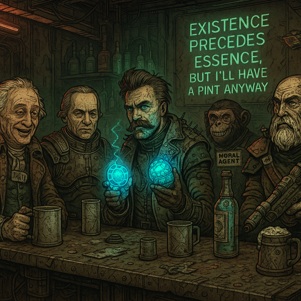A flickering, grimy dive bar in Argos Station orbiting the dead planet Kant-47. The jukebox only plays existential jazz. A glowing exit sign buzzes above a locked airlock door. The only way out is past five dangerously philosophical drinkers.